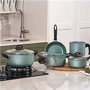 Olla c/tapa 20x10cm 2,7L, Cacerola c/tapa 18x9cm 1,9L, Cacerola c/tapa 16x8cm 1,3L, Sarten 20x4cm, Hervidor 14x12,5cm 1,8L. 6 Capas de revestimiento: 1 de alta resistencia, 3 de particulas de ceramica y 2 de antiadherente extra. Estructura de aluminio, tapas de vidrio, mangos y asas regenerados con al menos 50% de material reutilizado. Libre de PFOA. No apto induccion.