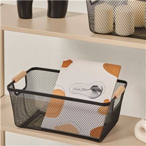 CESTO REJILLA C/ ASA DE MADERA 35x23x16CM NEGRO