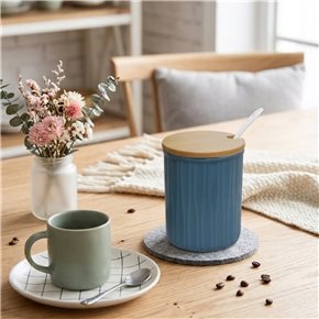 AZUCARERO/QUESERA CERAMICA C/CUCHARA Y TAPA MADERA AZUL