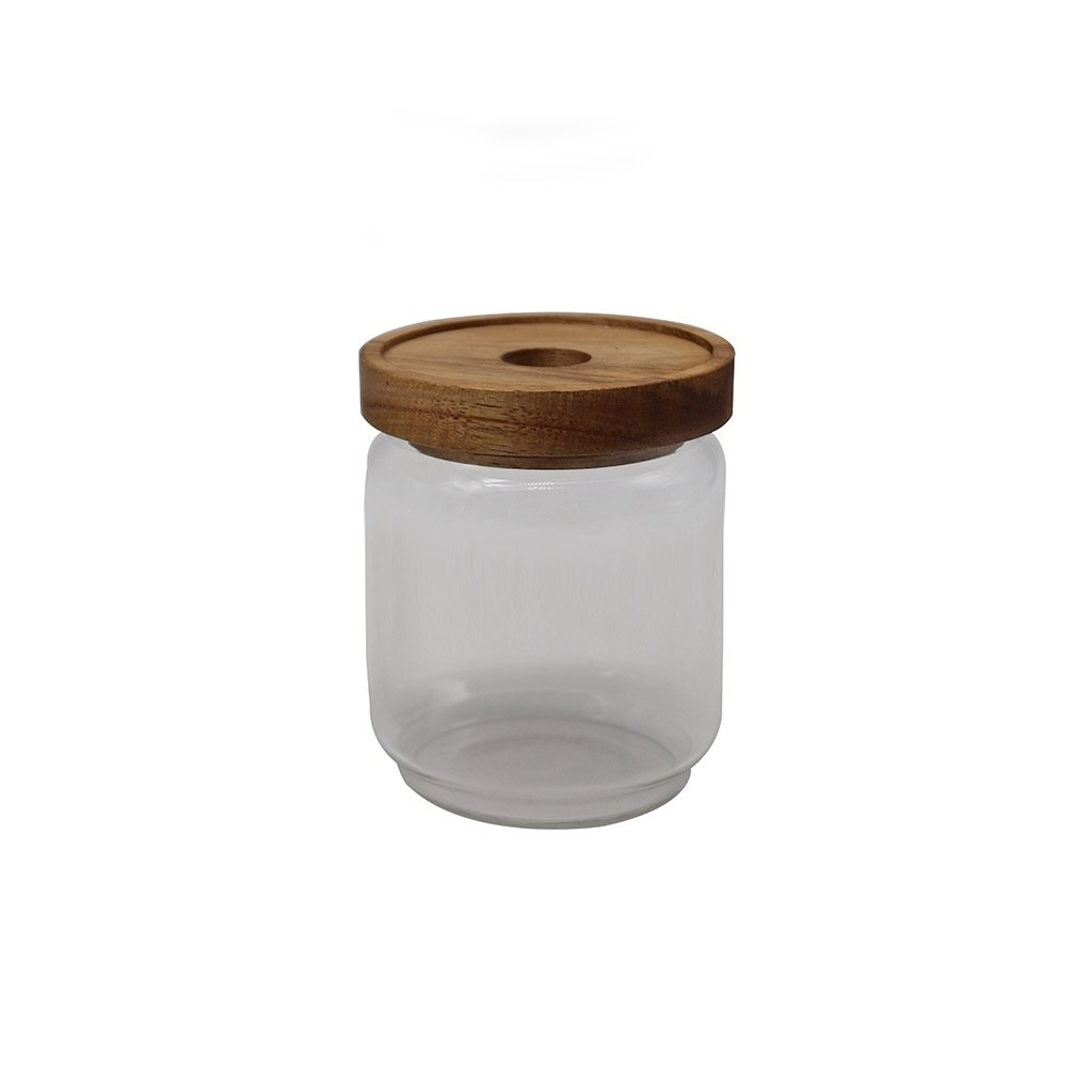 RECIPIENTE VIDRIO 400ML TAPA MADERA ACACIA D9XH9.5CM