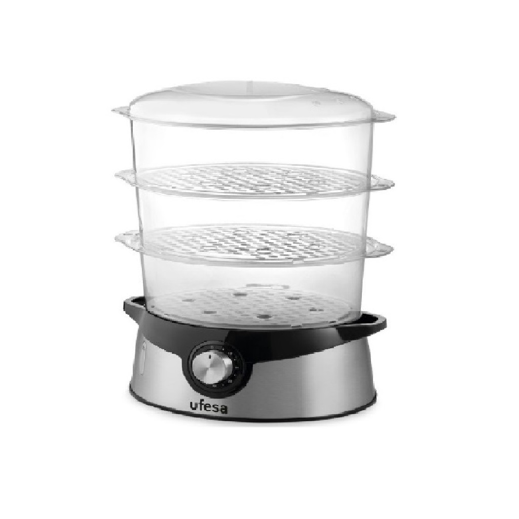 Potencia: 800 W/ 3 bandejas apilables con capacidad de 9 litros/ Nivel de agua visible/ Entrada de agua lateral para añadirla durante la cocción/ Temporizador de 60 min con apagado automático/ Cuerpo en acero inoxidable/ Accesorio: Cuenco de 1L para preparar arroz